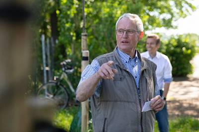 Horst Wibbeler vor dem BürgerwaldJeder Bürger konnte einen Baum erwerben und ihn mit einem Schild versehen lassen, um Baumart und Spender zu dokumentieren. Ende des Jahres besteht erneut die Gelegenheit beim Pflanzen der neuen Bäume „Baumpate“ zu werden und dieses Erfolgsmodell der CDU-Initiative zu unterstützen.